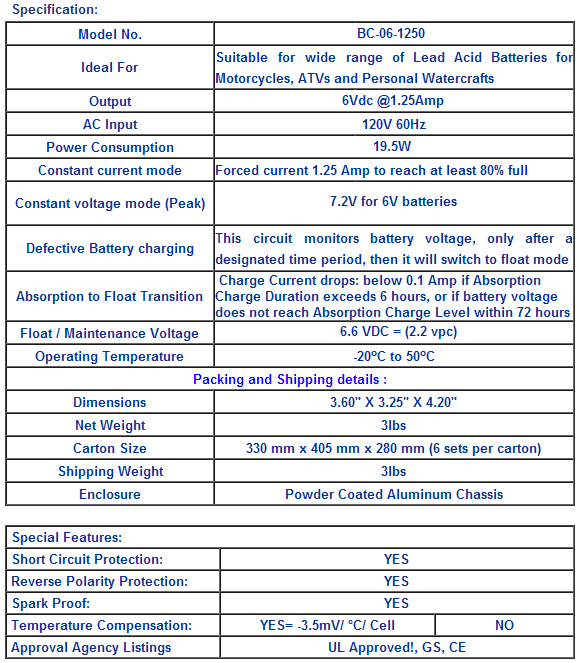 4-stages mircoprocessor based system for charging and maintenance, for all types of lead-acid batteries, including sealed, AGM, GEL, VRLA, maintenance free, and flooded. 6 Volts @ 1.25 Amp. UL Approved. Weight 3 lbs.
